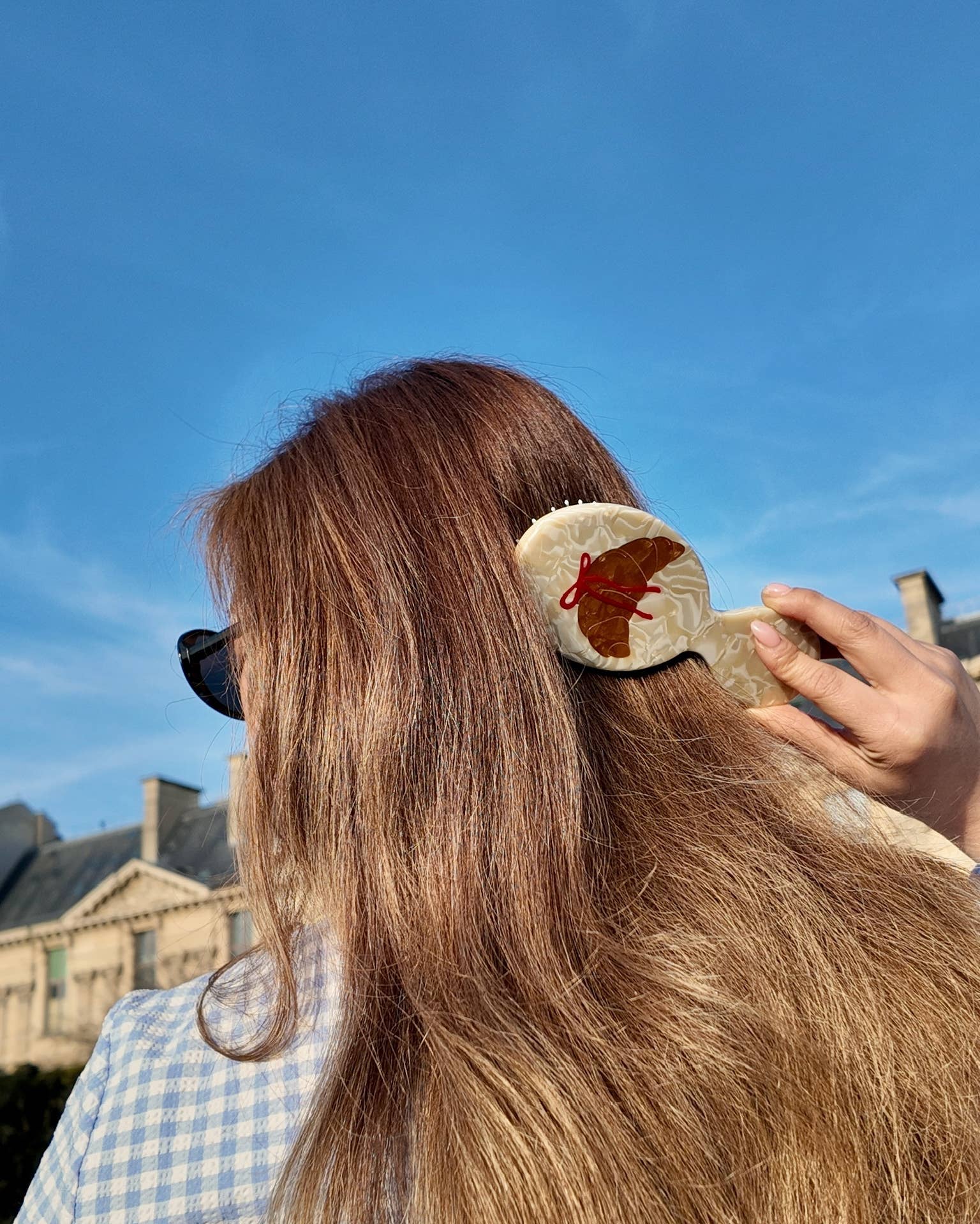 our hand-painted compact 2-1 perfect daily brushes are designed to go with everywhere. they're perfect for all your on-the-go hair needs. each hair brush is made of individually cut acetate pieces. featuring the iconic original croissant bow design, hand-painted by our solar eclipse artists our 2-in-1 perfect daily brush is designed for all hair types + textures.