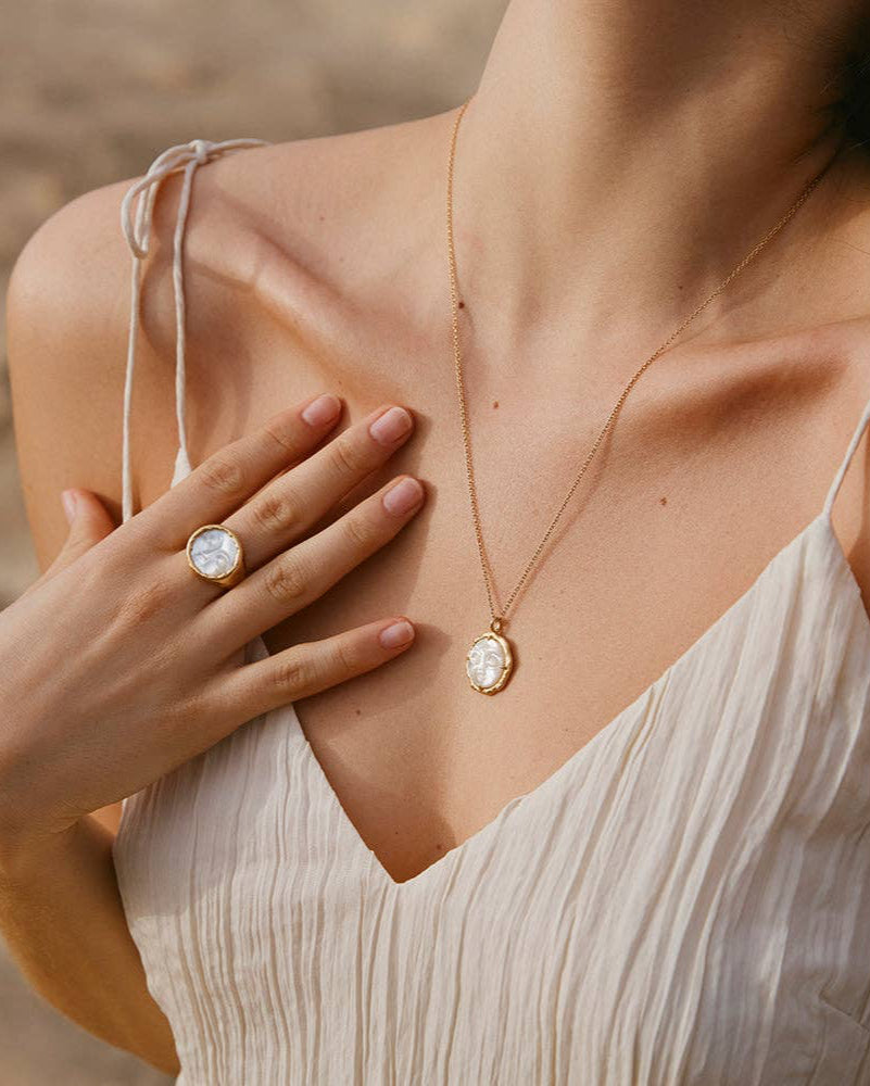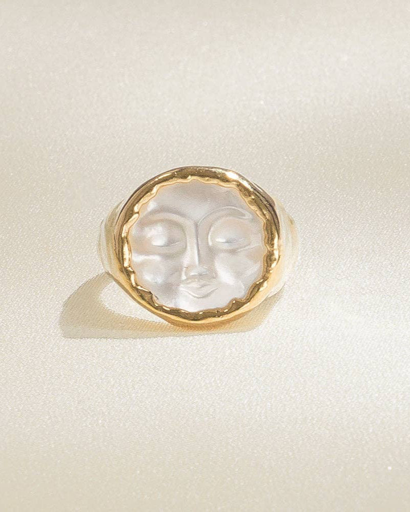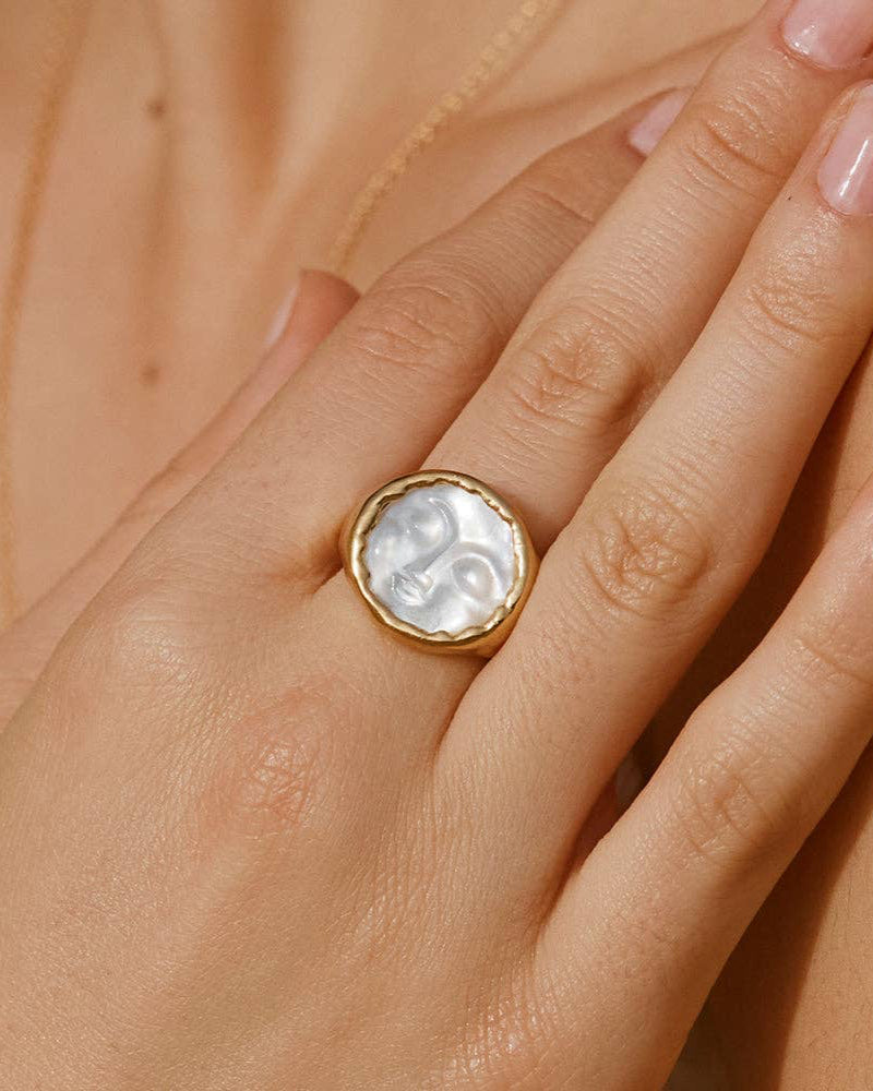 This luminescent mother-of-pearl moonface statement ring captures the serene glow of a full moon. Its carved moon face is set in a golden setting and reflects light with peaceful tranquility. Width : 18 mm (0.71") Inside diameter : see size guide Non-adjustable and available in 3 sizes Stone : Mother of pearl Gold plated (gilding : satin) Ethically made in France