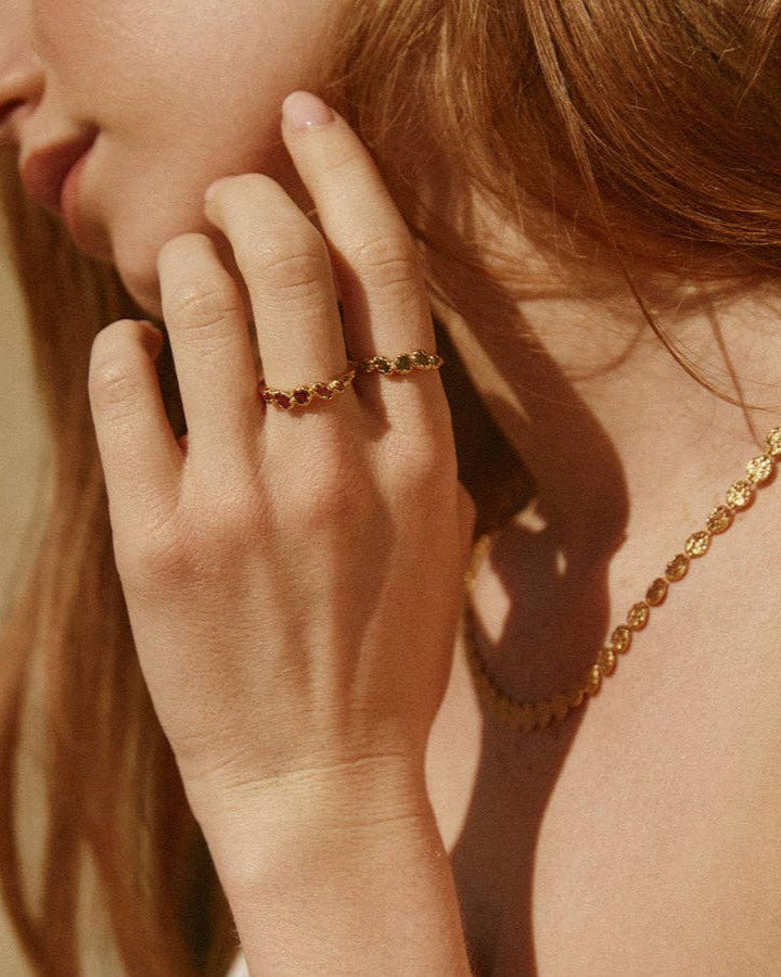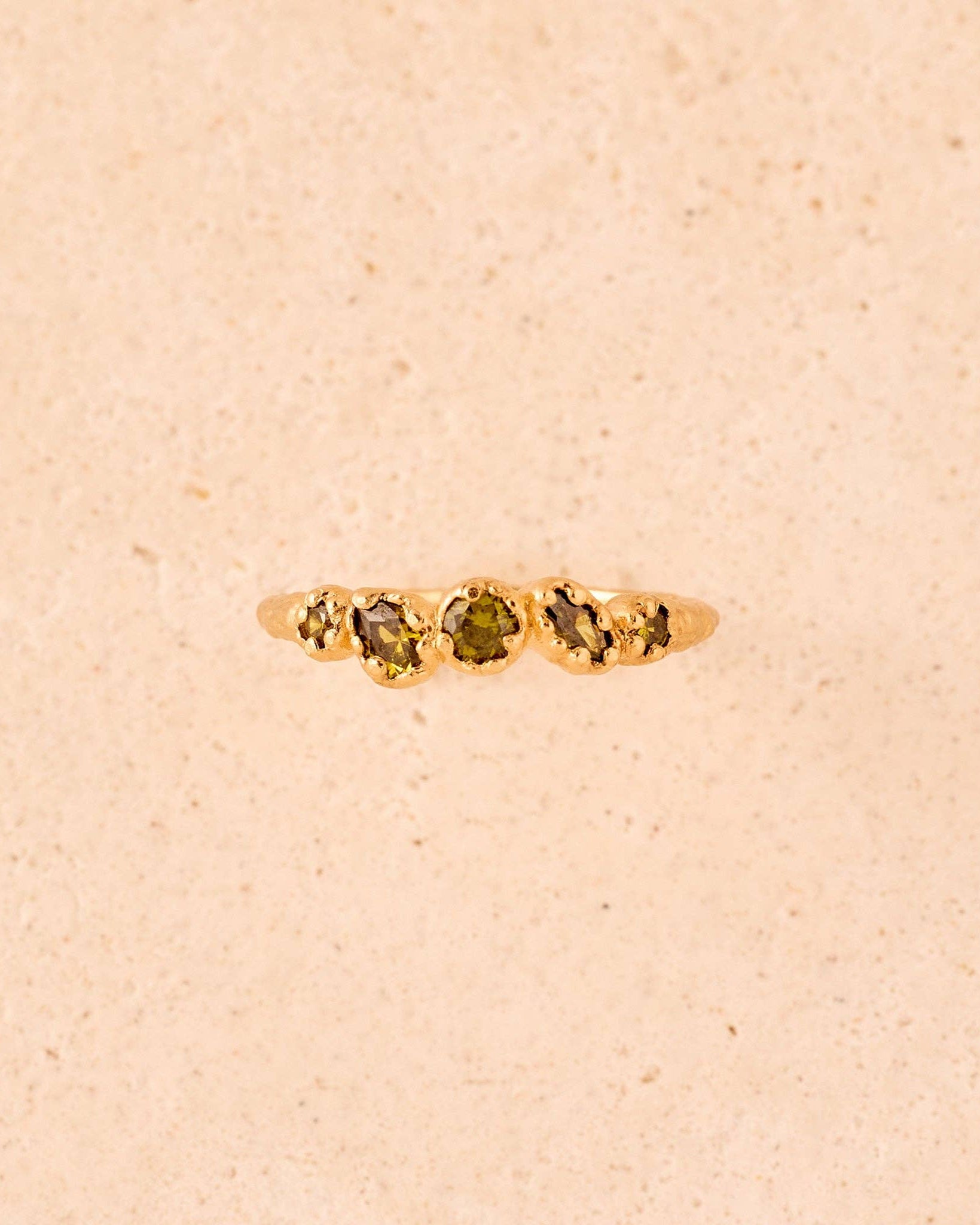 The Koré green slim cluster ring has five small dark green stones, each with natural variations in shade, organically and irregularly inlaid and handset in gold. 18kt gold plated
