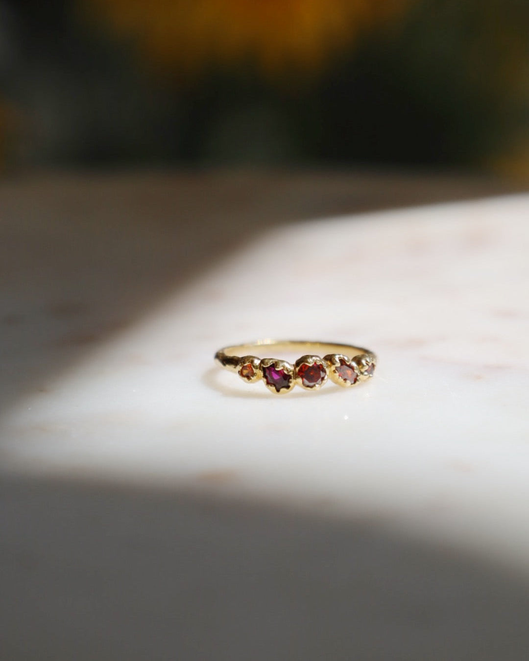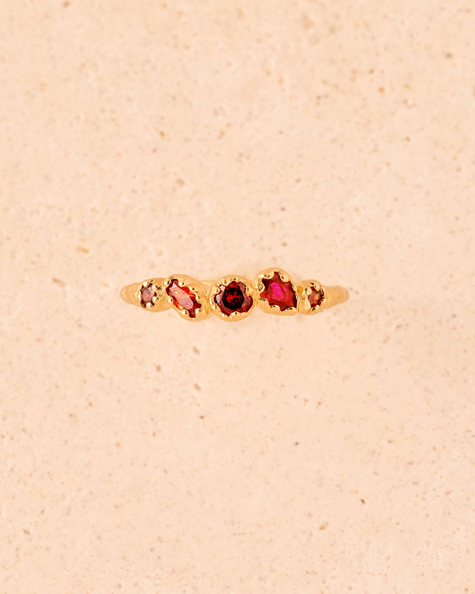 The Koré red slim cluster ring has five small red garnet stones, each with natural variations in shade, organically and irregularly inlaid and handset in gold.