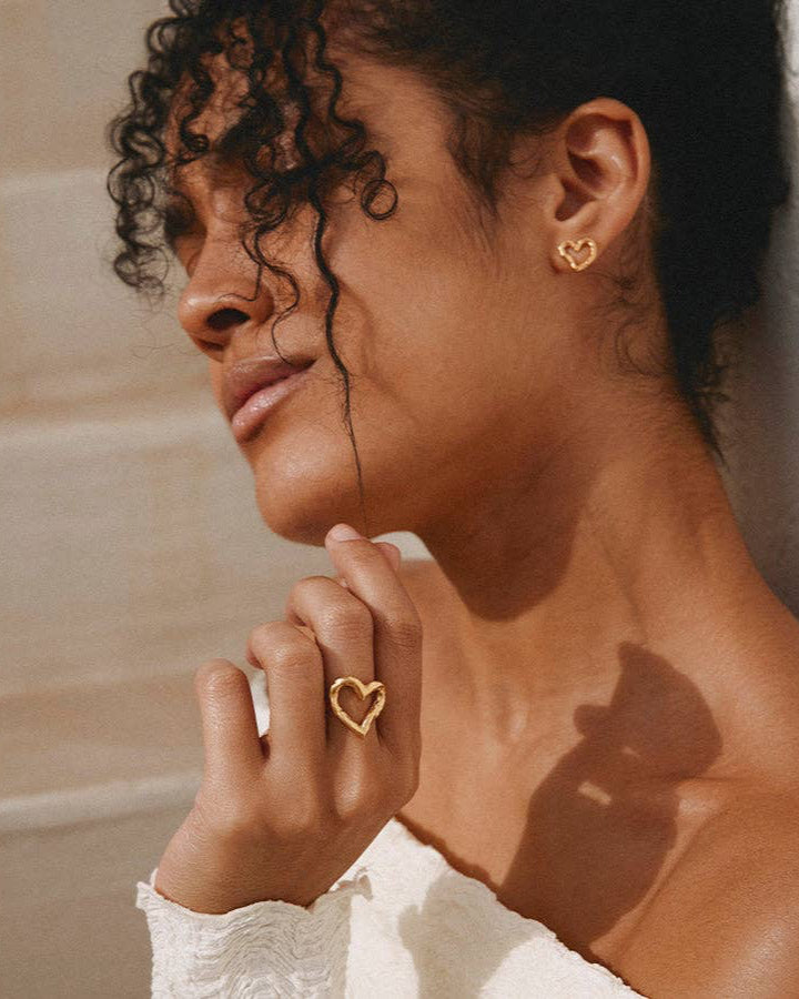 Our Liora open-heart ring perfectly fits the finger, with its thick lines and minimalist design. Its irregular, empty and almost molten shape offers a modern take on the classic heart. A bold, imperfect yet eternal symbol of love. Width : 20 mm (0.79") Inside diameter : see size guide Non-adjustable and available in 3 sizes Gold plated (gilding : satin) Ethically made in France