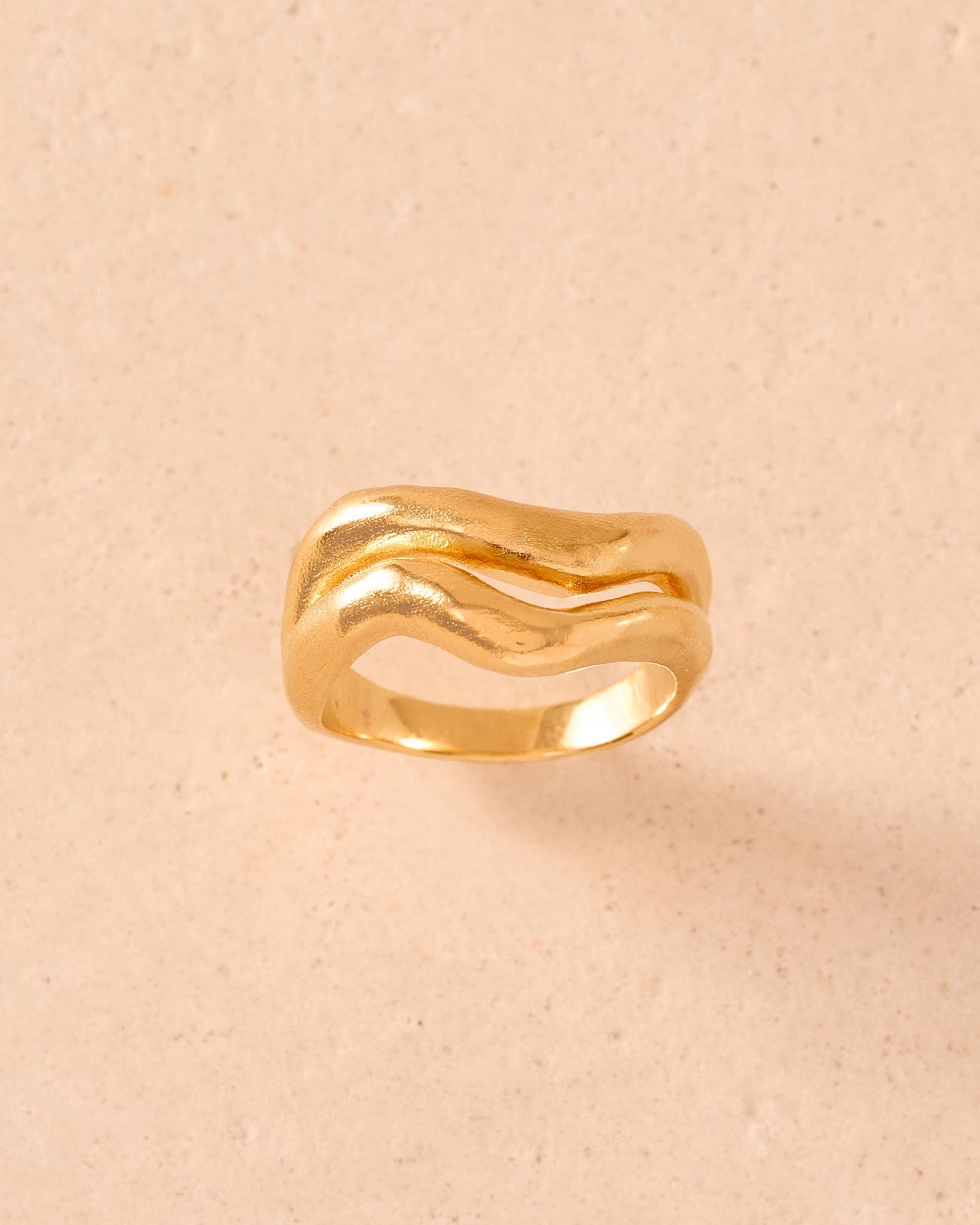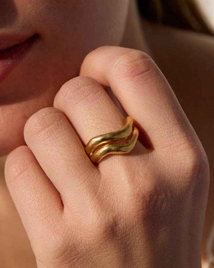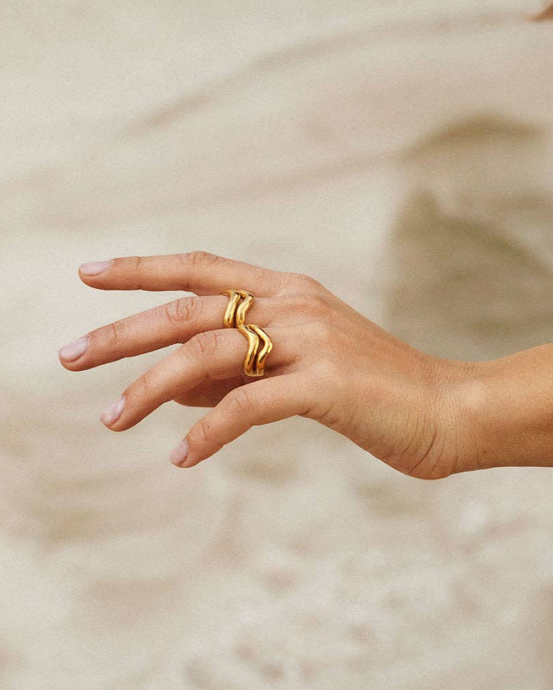 The Ondea twin ring features two stacked bands linked at the back and an organic, fluid silhouette. Its wavy detailing and subtle thickness are inspired by flowing water and wind-carved patterns in the sand. Width : 12 mm (0.47") Inside diameter